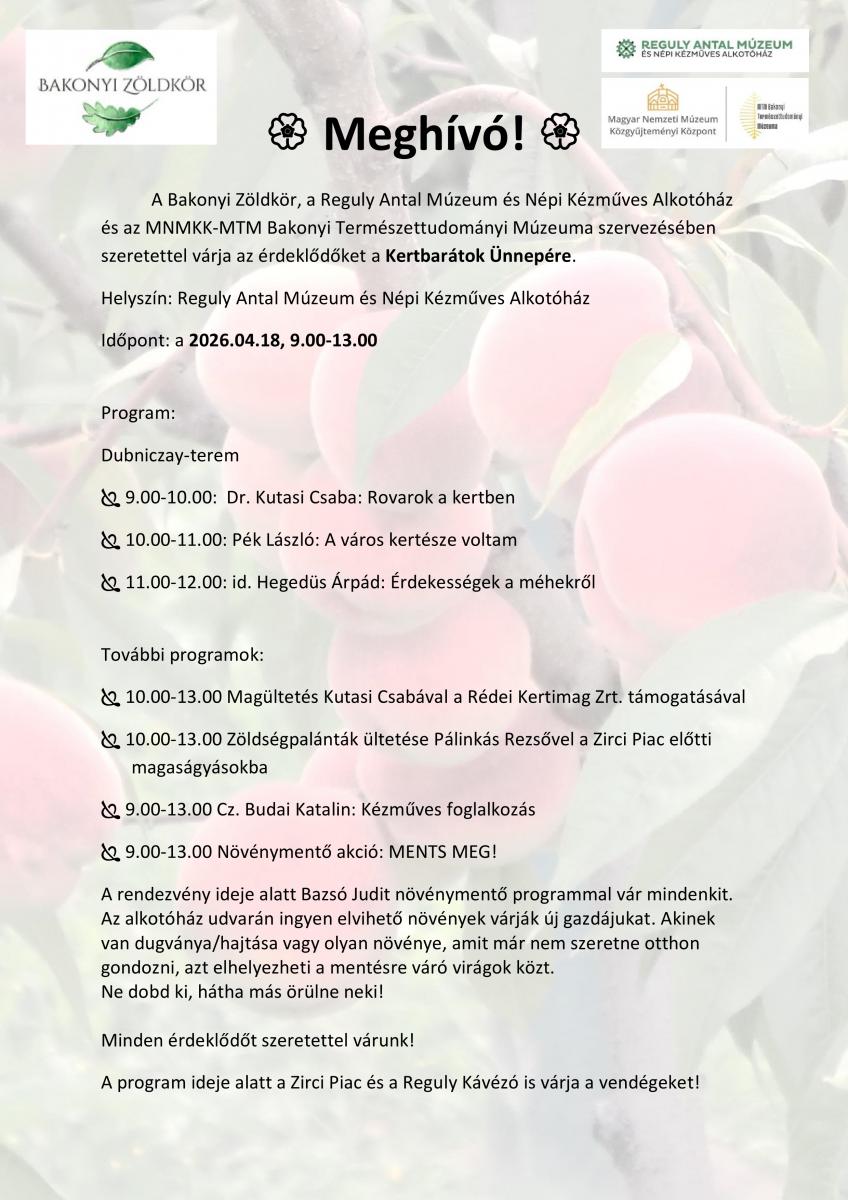 2026. április 18-án szeretettel várunk minden érdeklődőt az idei Kertbarátok Ünepére a Reguly Antal Múzeum és Népi Kézműves Alkotóházban! Címkék: kertkertbarátok ünnepebakonyi zöldkörRovat: Programok